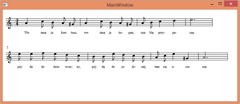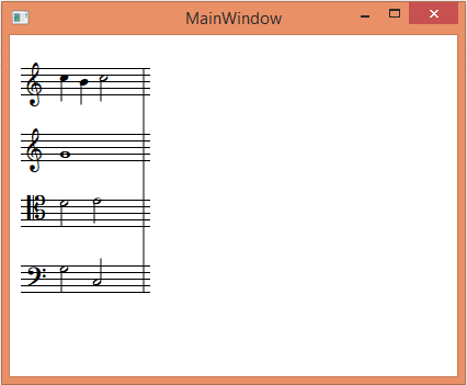 Now we can run our application and see the result. We’ve just create our first score. ;) Now we are going to add a few staves to our score. Add this in LoadTestData method: